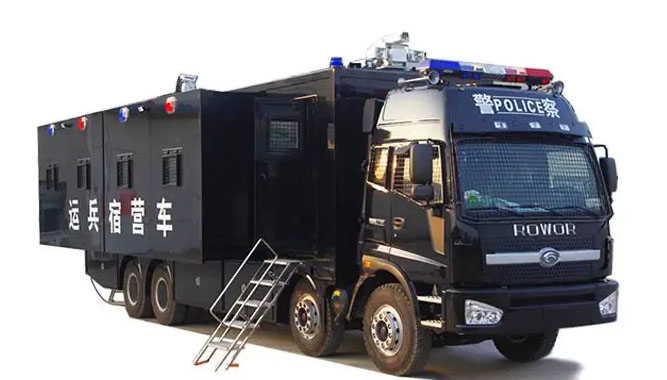 宿營(yíng)車是為滿足特殊環(huán)境下野外執(zhí)行任務(wù)、提高后勤保障能力研制開發(fā)的專用車輛。由越野型二類底盤加裝大板式方艙組成,方艙通過(guò)液壓系統(tǒng)傳動(dòng)、電氣系統(tǒng)控制實(shí)現(xiàn)左右兩側(cè)自動(dòng)擴(kuò)展。車輛配有空調(diào)和燃油暖風(fēng)機(jī),可保證方艙內(nèi)的溫度恒定在人體最適合的溫度。車內(nèi)具有能同時(shí)滿足32人的住宿空間,集住宿、運(yùn)輸及影視娛樂為一體,滿足公安、部隊(duì)處理突發(fā)性任務(wù)的快速機(jī)動(dòng)需要。具有功能齊全、性能優(yōu)良、操作簡(jiǎn)便、保障能力強(qiáng)、適應(yīng)性廣等特點(diǎn)。